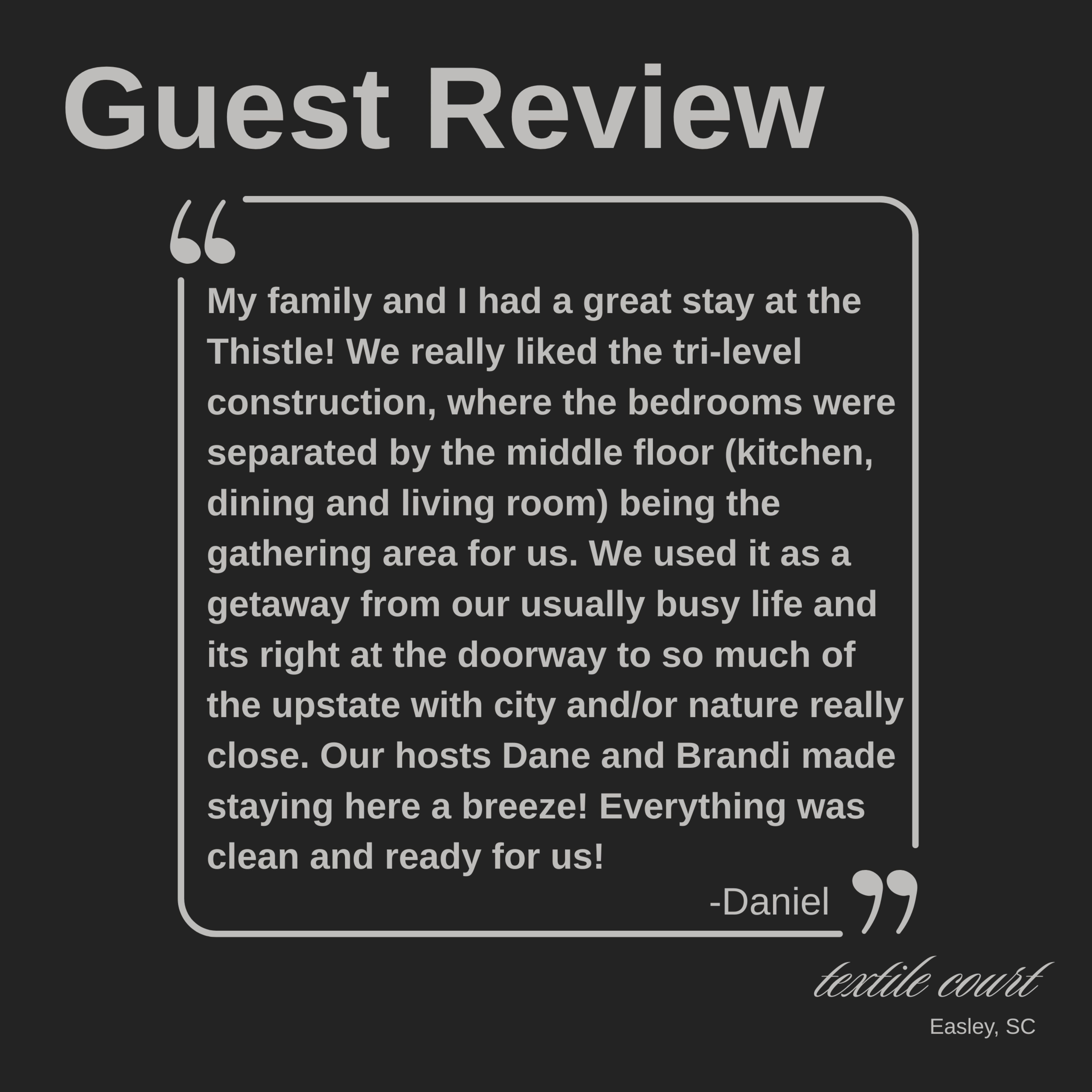 Experience luxury in this modern oasis walking distance to downtown. - Just 18 miles from Clemson and 13 miles from downtown Greenville - Full Kitchen - 2 comfy bedrms - 2.5 baths - Private balcony - Just 5 Minute walk to Silos food hall and doodle trail. - Just a 10 Minute walk to downtown shopping and restaurants - Free Private Parking! The Thistle is the perfect location for game weekends & family visits w/ college kids and business travel! Book your stay before the calendar fills!