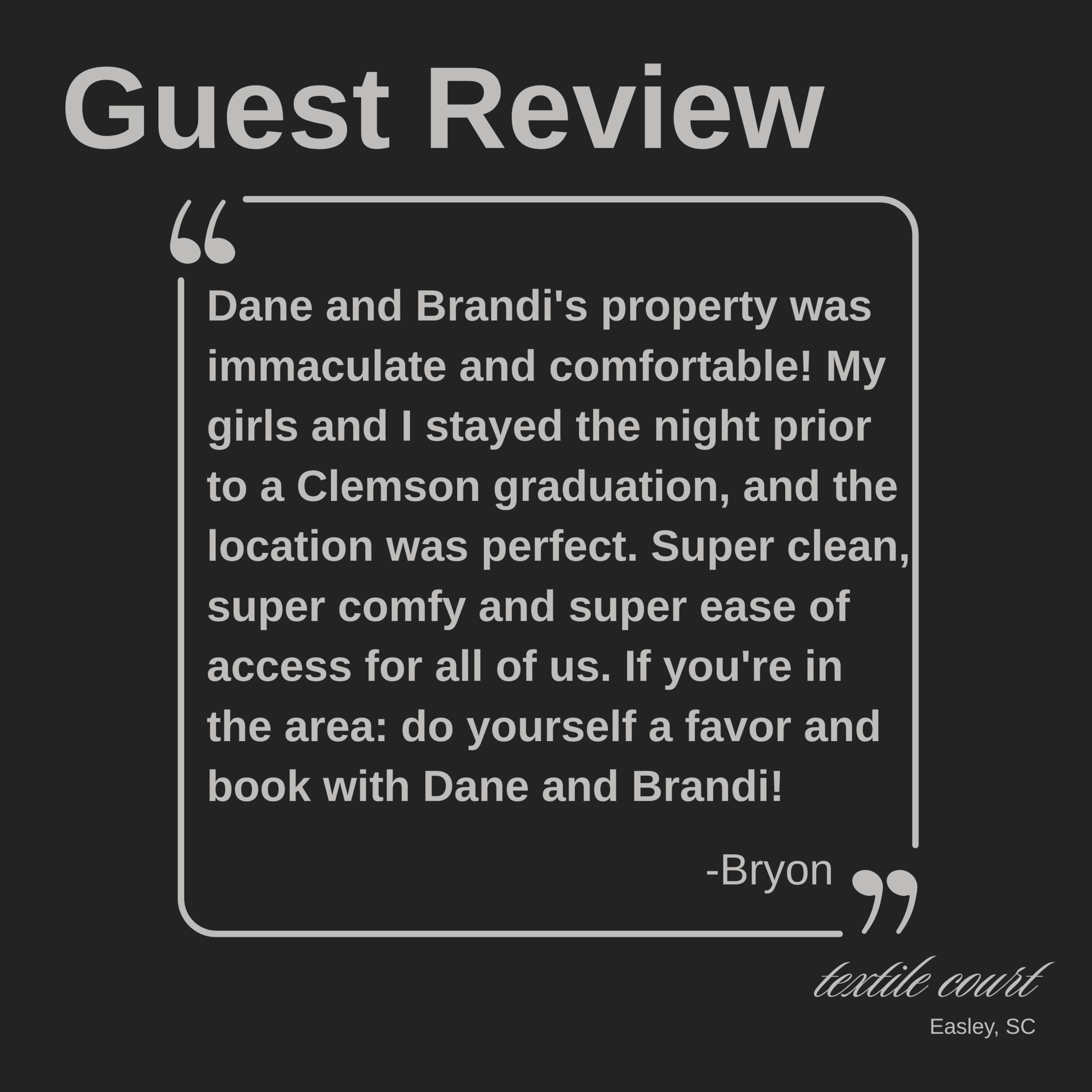 Other Details to Note ✅ Laundromat conveniently located nearby for your use ✅ Exterior security cameras ensure safety and peace of mind ✅ Essentials like coffee, shampoo, and soap are provided ✅ Ideal for both short-term visits and longer stays ✅ Room-darkening shades in bedrooms for a restful night's sleep ✅ Additional pillows, blankets, and hangers available for extra comfort ✅ Smoke alarm, fire extinguisher, and first aid kit provided for safety ✅ Flexibility to suit your stay duration needs Ready to unwind and explore the best of Easley? Book your stay at our inviting townhome now, and create cherished memories in this charming location! Places to eat & drink: In Easley: - Old Post 1940 Coffee Create Celebrate (coffee shop) - The Smokin’ Pig (BBQ) - Alebrijes (Mexican) - The Silos (food hall & brewery; check website for events) - EleMenT (casual fine dining) In Greenville (13 miles away): - Another Broken Egg (breakfast/brunch) - Giovanni’s (Italian, dinner only) - Pomegranate on Main (Persian) - Sassafras (Southern bistro) - Juniper (rooftop bar & dining; smart casual dress code) Other small towns: - Authentique French Creperie (Simpsonville) - Tropical Smoothie Café (Powdersville) - Thai Cuisine (Downtown Simpsonville) - Dilliard’s (ice cream in Greer & Greenville) - City Scape Winery (Pelzer) Places to shop: In Downtown Easley: - Circa Makers & Merchants - Poor Richards’ Booksellers In Easley: - Home Decorators Warehouse - Revival Antiques - Under the Carolina Moon In Downtown Greenville: - Ballard Designs - Mast Gen - The Cook’s Station - The Spice & Tea Exchange - Traveling Chic Boutique - Vintage Now Modern Places to explore: Towns to visit: - Pickens (7 miles) - Clemson (18 miles) - Travelers Rest (18 miles) - Pendleton (18.5 miles; check out Swamp Fox Distilling) - Simpsonville (25 miles; check out Upstate Pinball & Arcade Museum) - Greer (31 miles) Outdoor activities: - The Doodle Trail (mere blocks away) - Swamp Rabbit Trail (13 miles, Greenville) - Falls Park (13 miles, Downtown Greenville) - Caesar’s Head (46 miles)